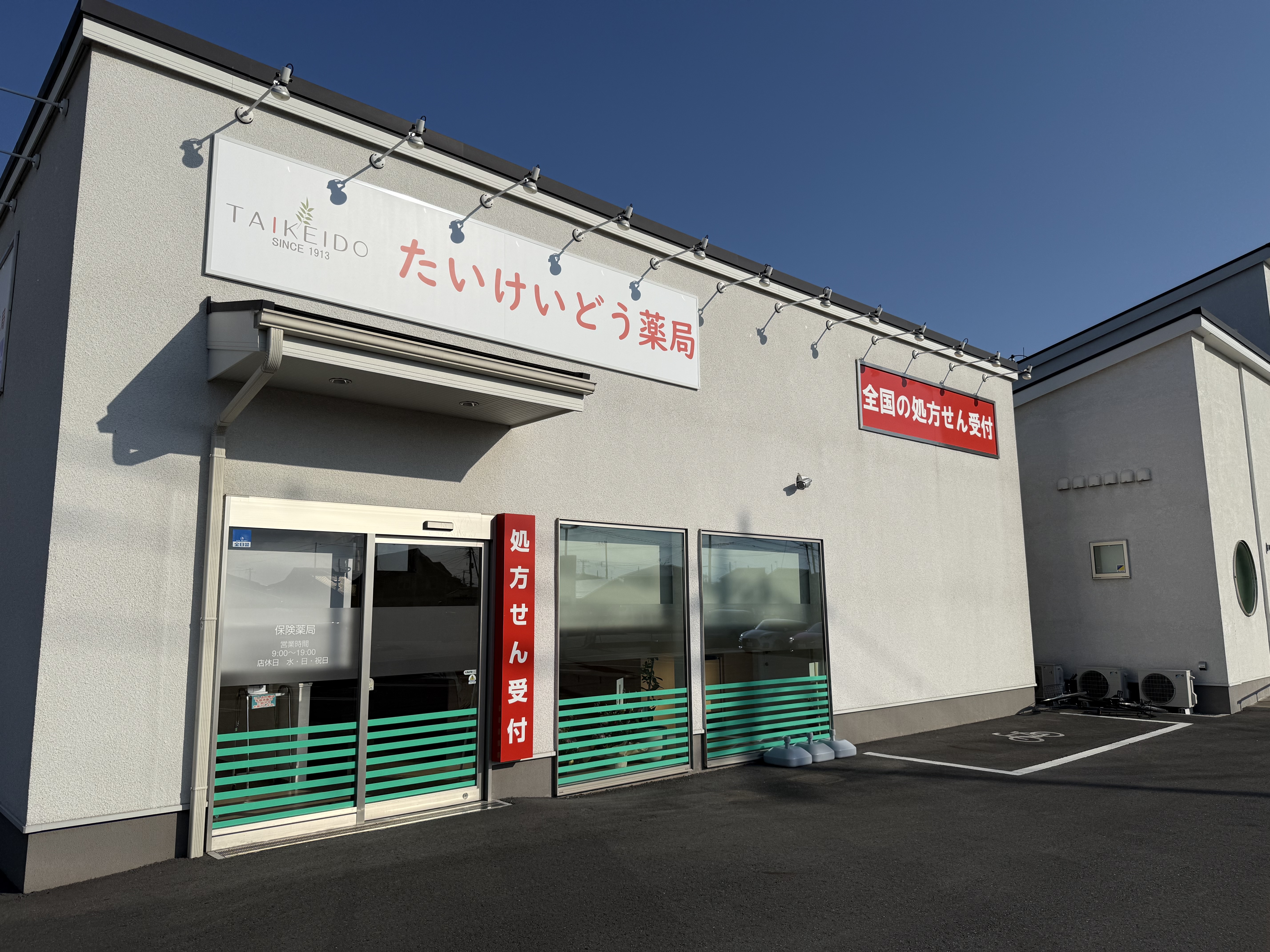 たいけいどう薬局は、見通しのよい交差点に位置し、ゆとりある駐車場でどなたでも安心してご利用いただけます。